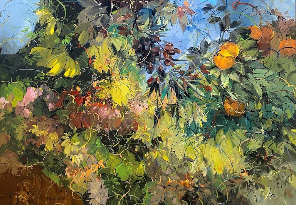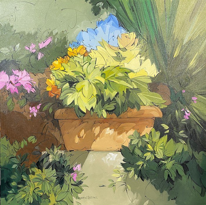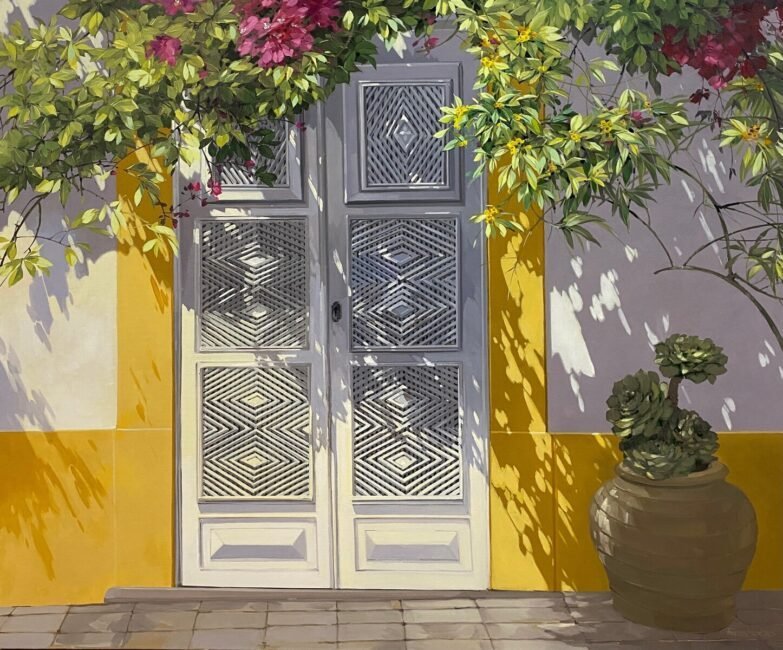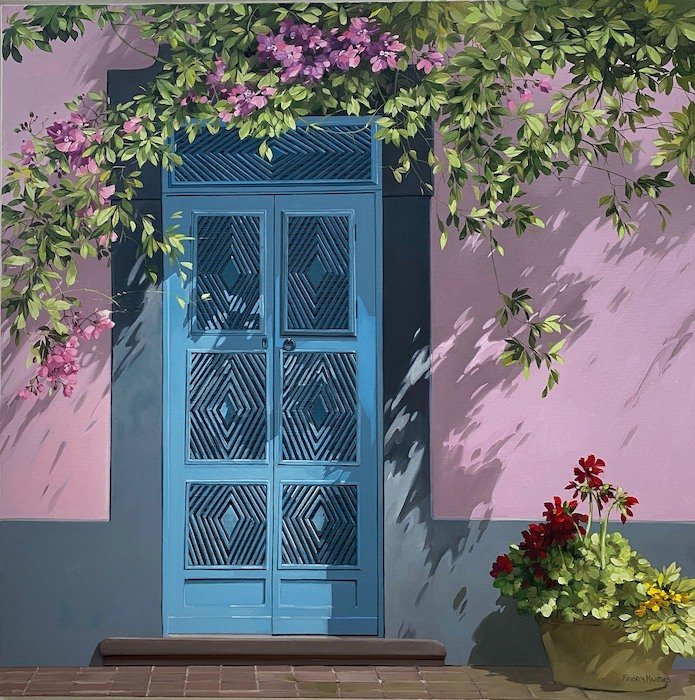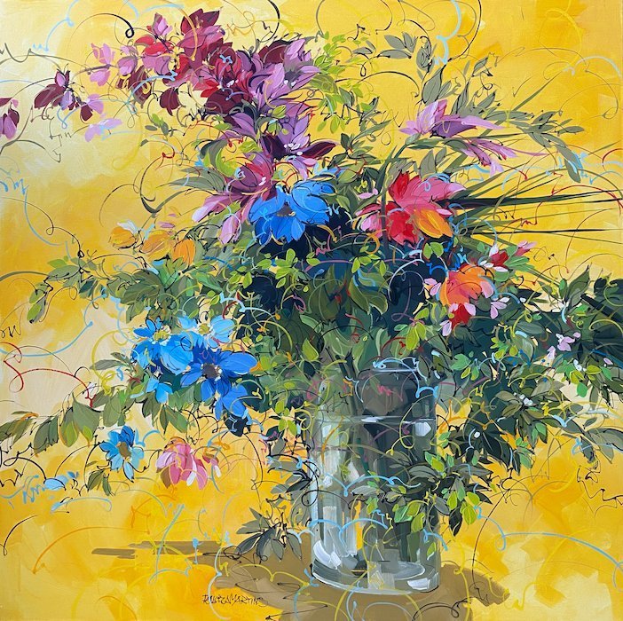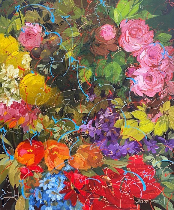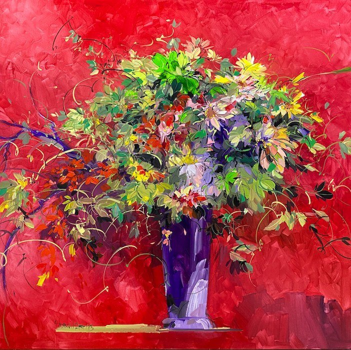 His most recent oil paintings burst with vibrant floral colours and can transform any room into a bright, Mediterranean paradise.