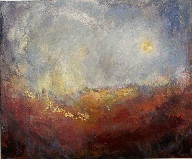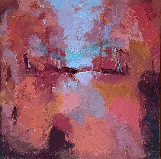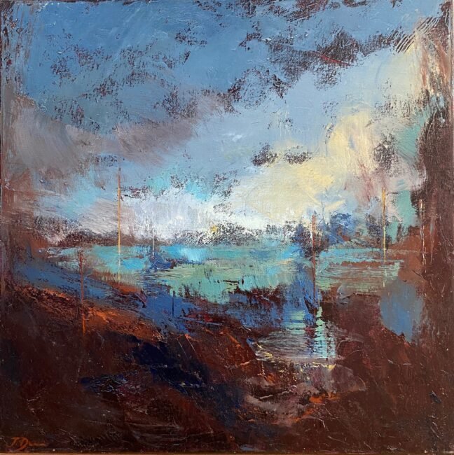 “I am inspired by the Algarve landscape. I try to capture an impression of its transient nature, working across the canvas from dark to light, layer-by-layer, brushing on, scraping off, over and over as a colour-mood begins to develop and a story begins to emerge.