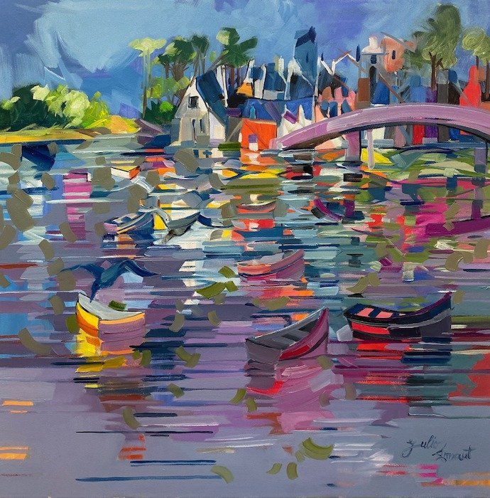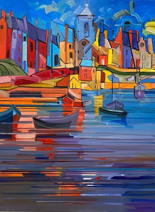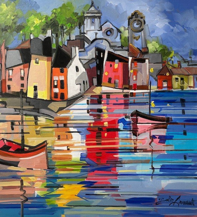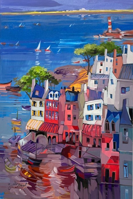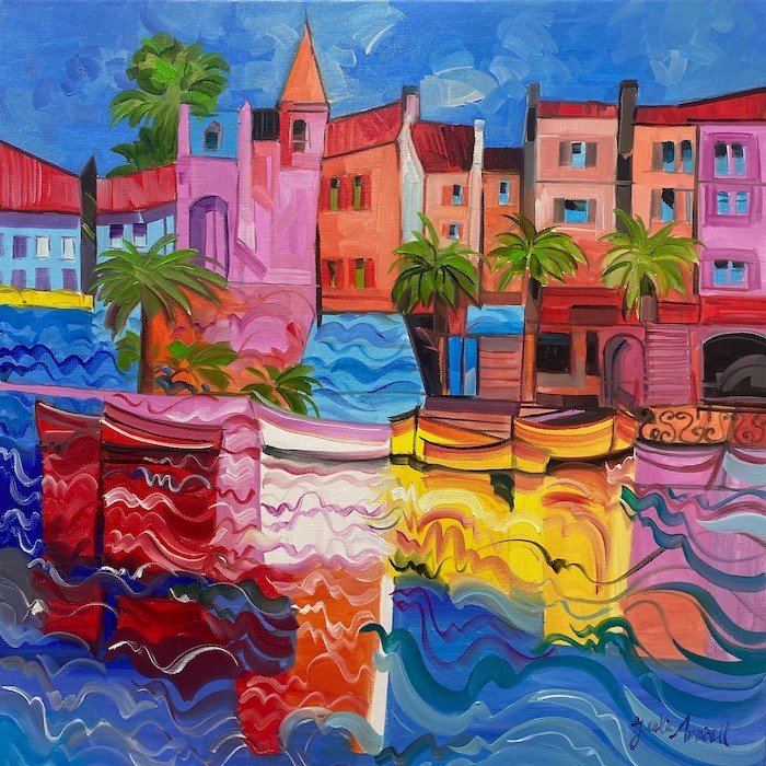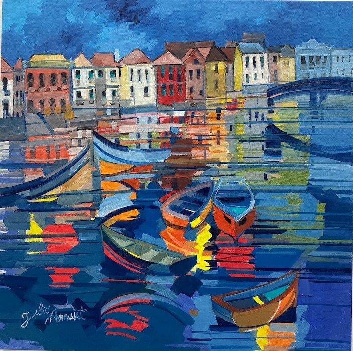 Julio Arnoux, originally from France now living in Tavira, has a unique, almost primitive cubist style which is bursting with colour and, depicts the beautiful town of Tavira in a wonderfully original way.
