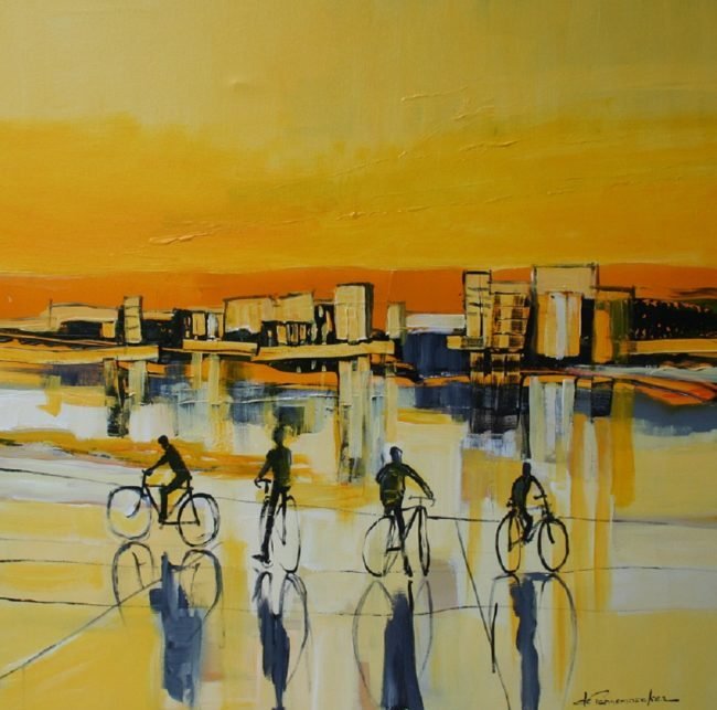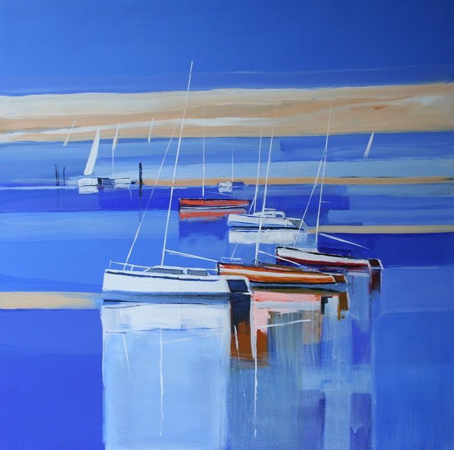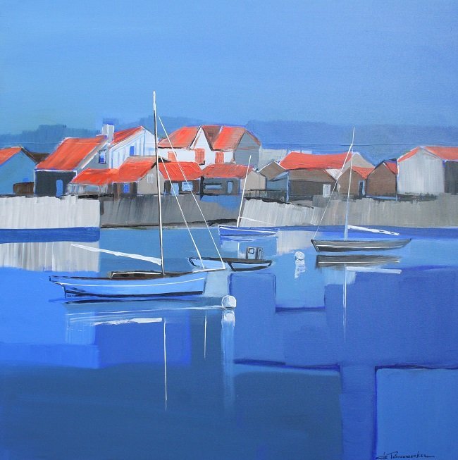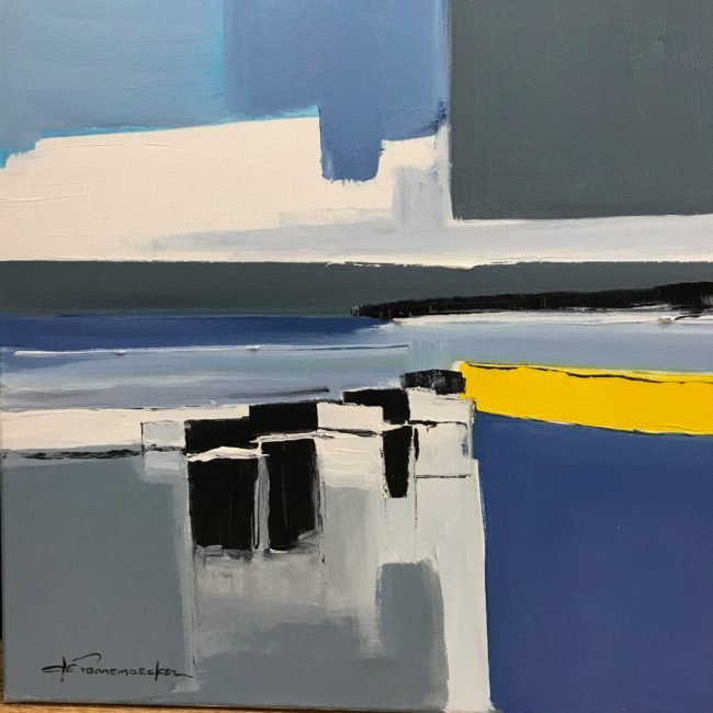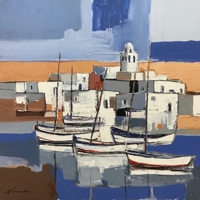 His acrylic and oil paintings reveal an awareness of space and an understanding of the architectural construction of objects. This cubist approach enables him to create a sense of volume on a two-dimensional canvas.