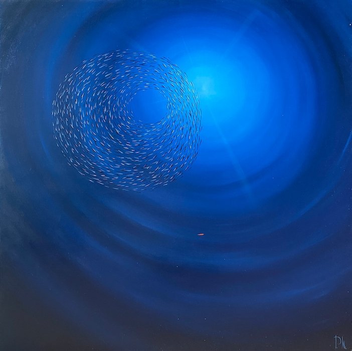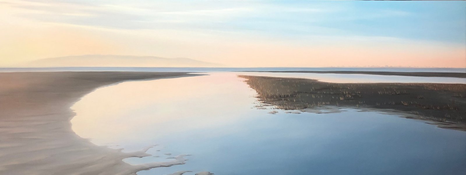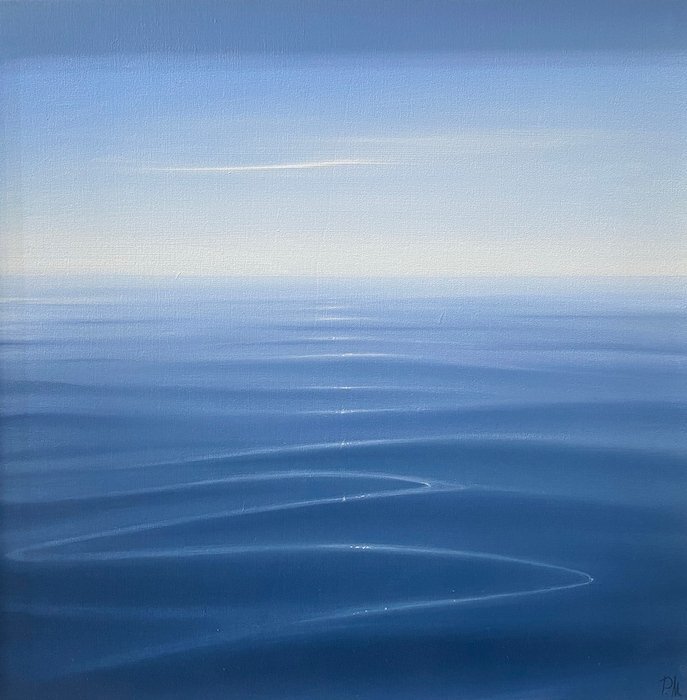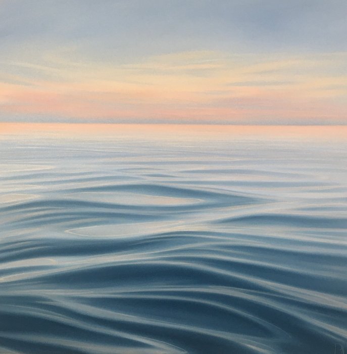 He paints alluring paintings that conjures a serene seascape through minimalist lines and soft colours, meticulously layered. The ever changing hues of the sky and ocean, eloquently narrating the sublime beauty of transience.