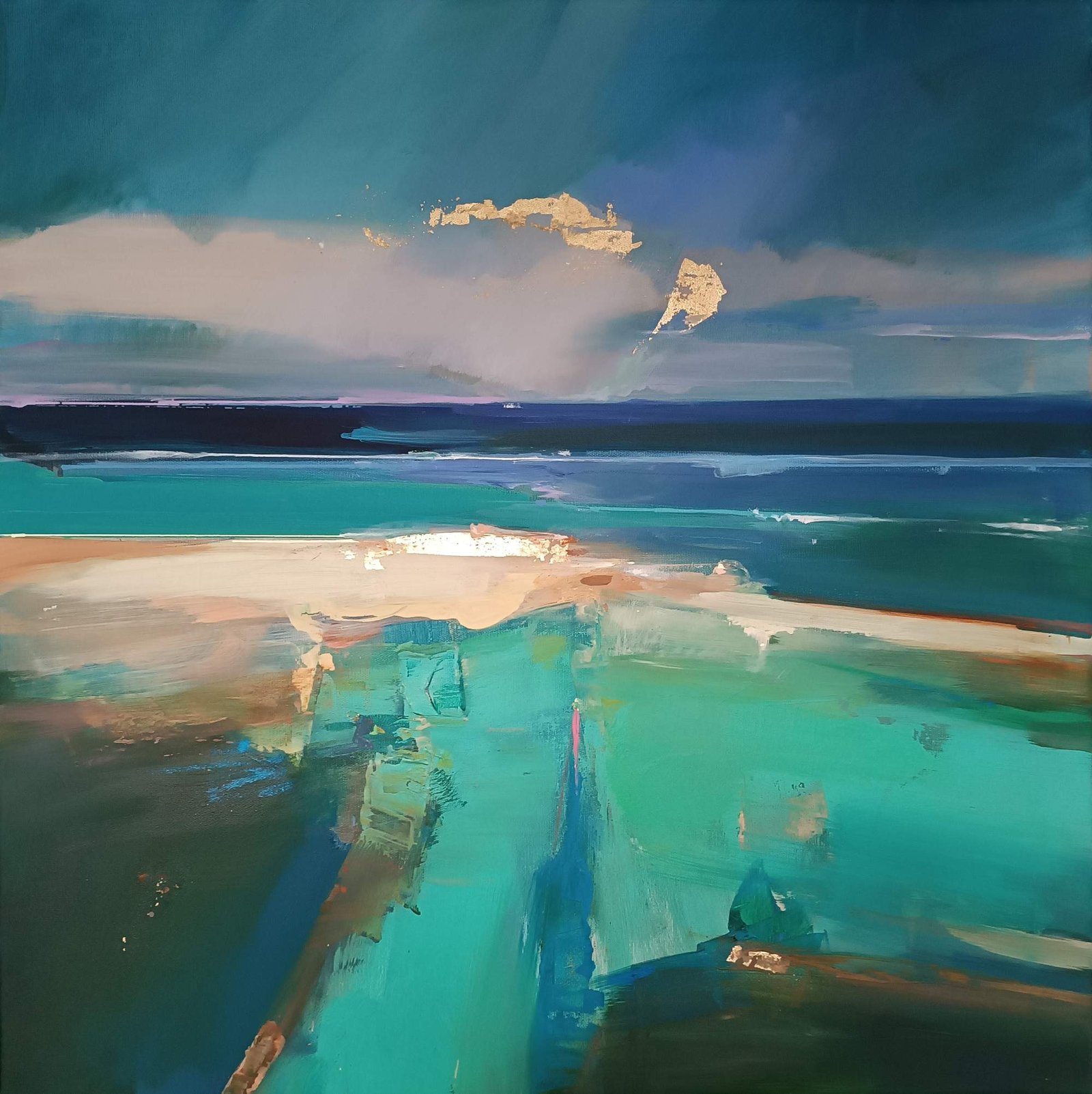 Acrylics, pastels and gold leaf on canvas